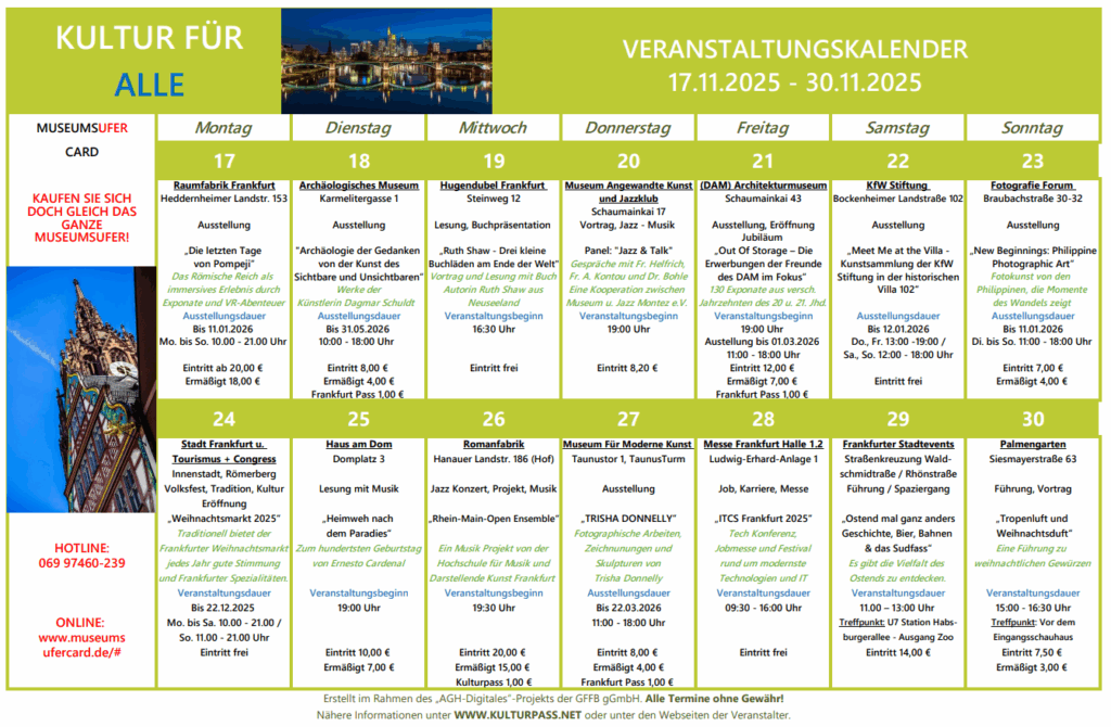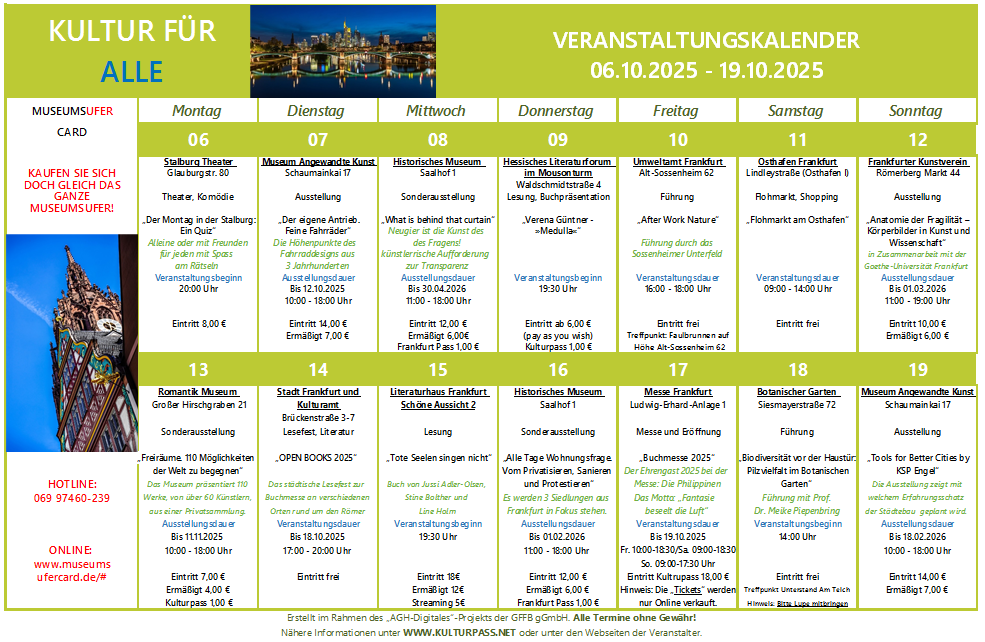 Auf unserer Website „ErlebnisRaum Frankfurt“ berichten wir zum umfangreichen Angebot der Frankfurter Kulturszene, portraitieren Stadtteile und geben wertvolle Tipps für Freizeitaktivitäten, die verschiedene Zielgruppen ansprechen. Wir möchten Menschen jedes Alters und unabhängig ihrer sozialen Herkunft für das kulturelle Angebot in Frankfurt am Main begeistern und einen Beitrag leisten, deren Teilhabe zu verbessern. Genau für diese Zielgruppe spürt unser erfahrenes Team jeden Montag bis Freitag interessante Themen zu Kultur- und Freizeitgestaltung auf, recherchiert sorgfältig, oft direkt vor Ort und bereitet die Informationen anschließend redaktionell kompakt auf.