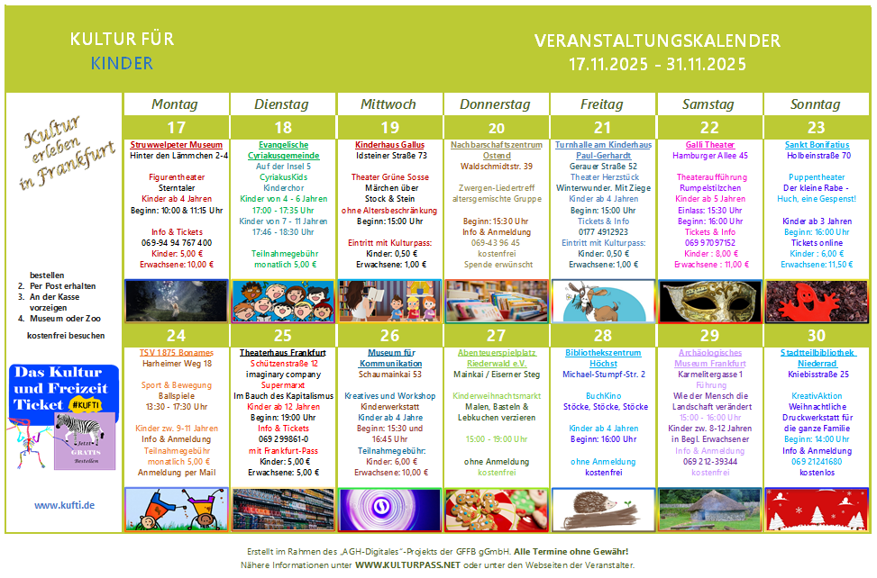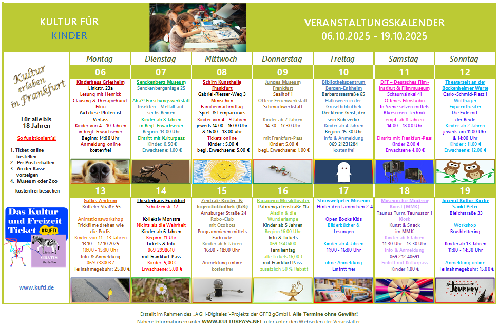 Das macht die Arbeit spannend und anregend, wobei wir in konstruktiven Diskussionsprozessen nach der besten Darstellungsform suchen. Am Ende steht immer ein Ergebnis, auf das wir stolz sind. Allen ist Interesse am kulturellen Leben ihrer Stadt Frankfurt gemein. Somit halten wir Sie, mit dieser Homepage über die Frankfurter Kulturszene auf dem Laufenden. Der Anspruch, Soziales und Kulturelles in den Stadtteilen zu verbinden, wird von den Teilnehmer*innen an der Qualifizierungsmaßnahme der GFFB gGmbH verwirklicht.