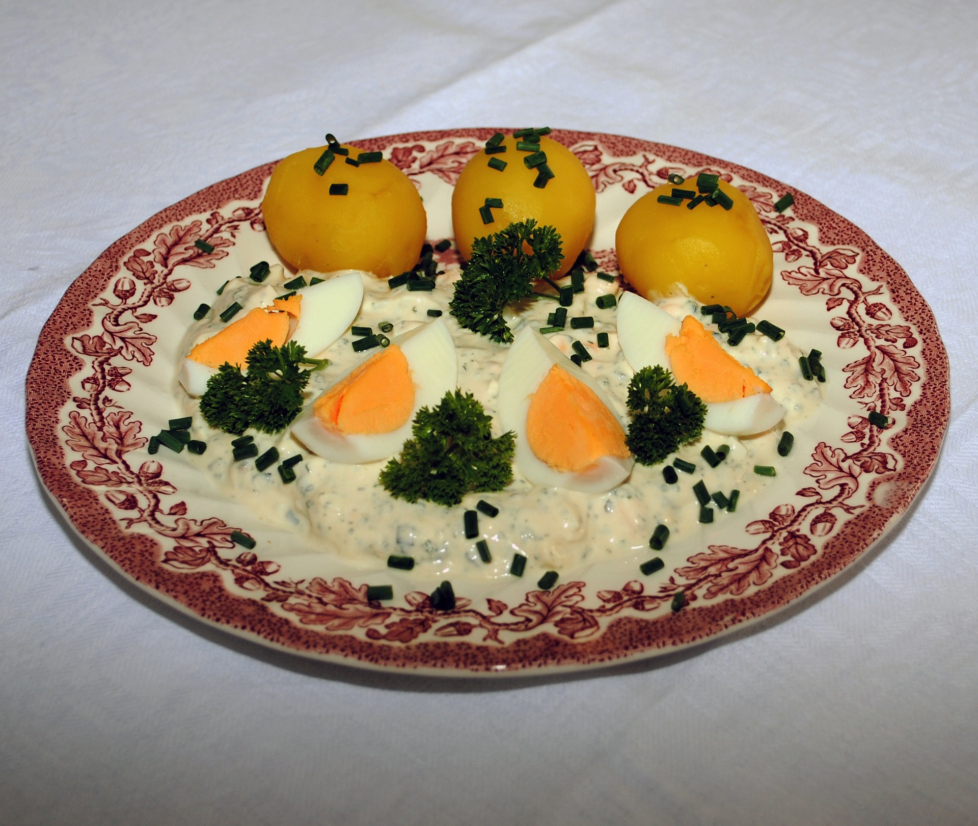 Die Frankfurter erwerben zu Ostern die Kräuter für die Grüne Soße auf einem der vielen Wochenmärkten. Krause Petersilie, Schnittlauch, Sauerampfer, Borretsch, Kresse, Kerbel und Pimpinelle sind bereits in einer Tüte zusammengefasst. Traditionell passt die Frankfurter Grünen Soße am besten zu frischen, regionalen Kartoffeln.
