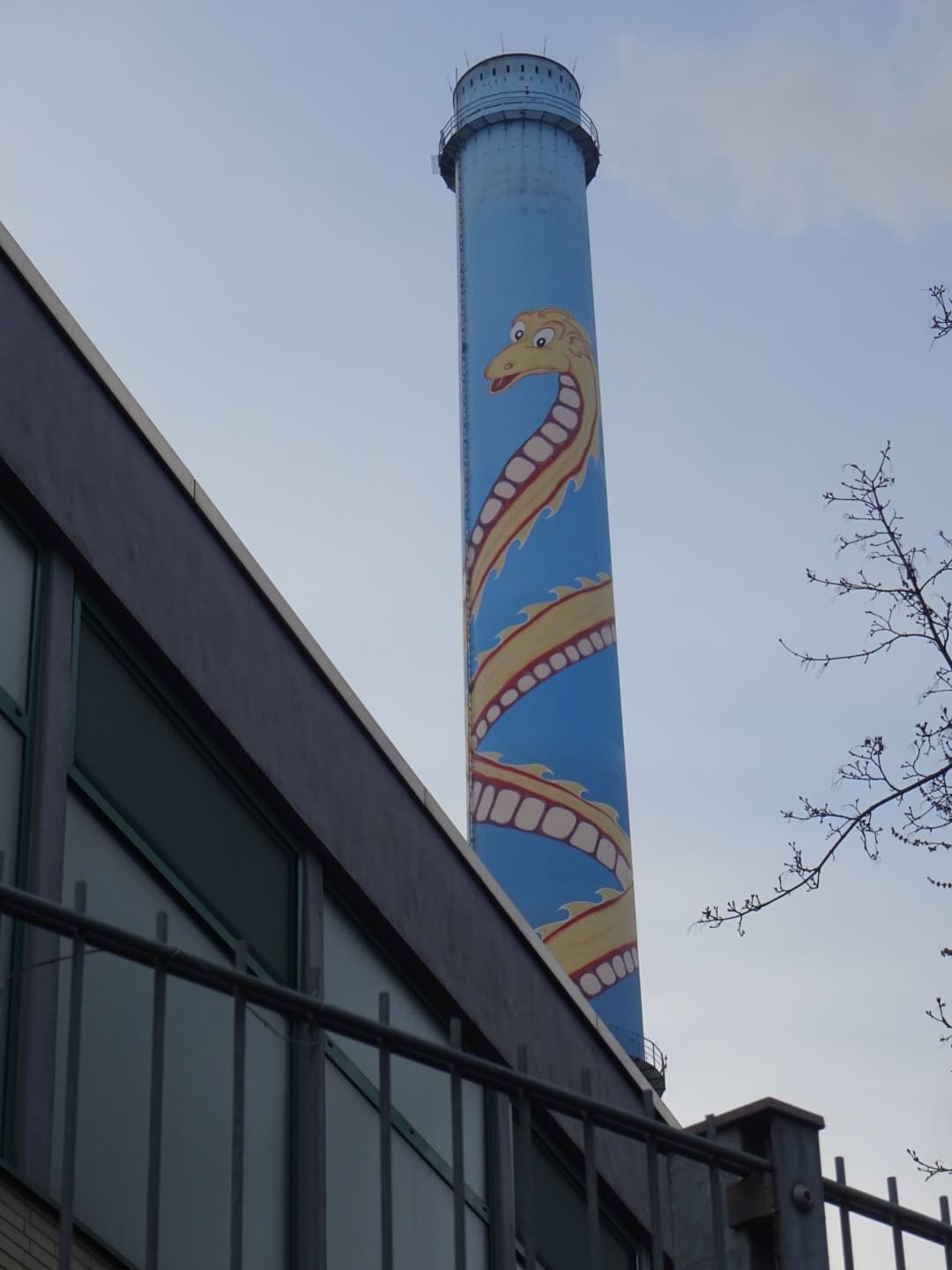 In der Müllverbrennungsanlage in Frankfurt-Heddernheim entsteht aus Abfall neue Energie. Schon von weitem sichtbar ist der 110 Meter hohe Schorn­stein der Anlage. Das bunte Graffiti auf dem gemauerten Kamin stellt den feuerspeienden Drachen Fessie dar, der als Maskottchen der Frankfurter Entsorgungsgesellschaft FES gilt.